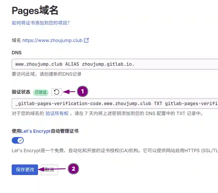 此时我们静待几分钟,因为解析生效需要一点时间,然后回到之前那个页面点击刷新按钮,你会发现验证状态变绿了。此时我们就能保存更改了